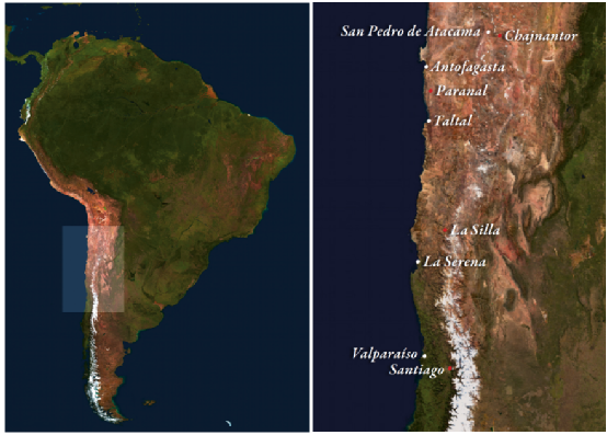 位于南美洲南北向最長的國家——智利。右側(cè)是左側(cè)白色陰影區(qū)域的放大圖,可以看到La Silla, Paranal,Chajnantor這三個(gè)臺站的位置。