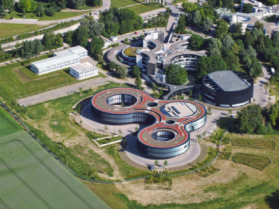 鳥瞰已搬到德國加興(Garching)的歐南臺總部,下方的紅色頂建筑和其上方的灰褐色頂建筑為總部主樓,右側(cè)黑色圓形建筑為技術(shù)部建筑。左側(cè)方形建筑則是集裝箱搭建的臨時(shí)建筑,此前的自適應(yīng)光學(xué)部就占據(jù)此小樓。